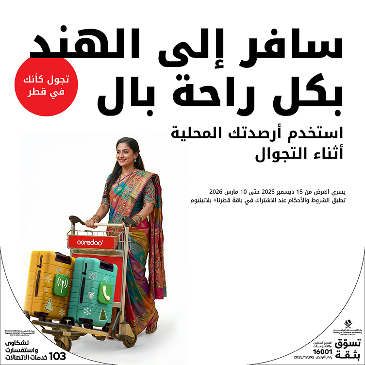 فمن 11 ديسمبر 2025 ولغاية 10 مارس 2026، يمكن للعملاء المشتركين في أي مفتاح “تجوّل كأنك في قطر” أو في باقة قطرنا+ بلاتينيوم الاستمتاع بأرصدة باقتهم المحلية أثناء التجوال في الهند.