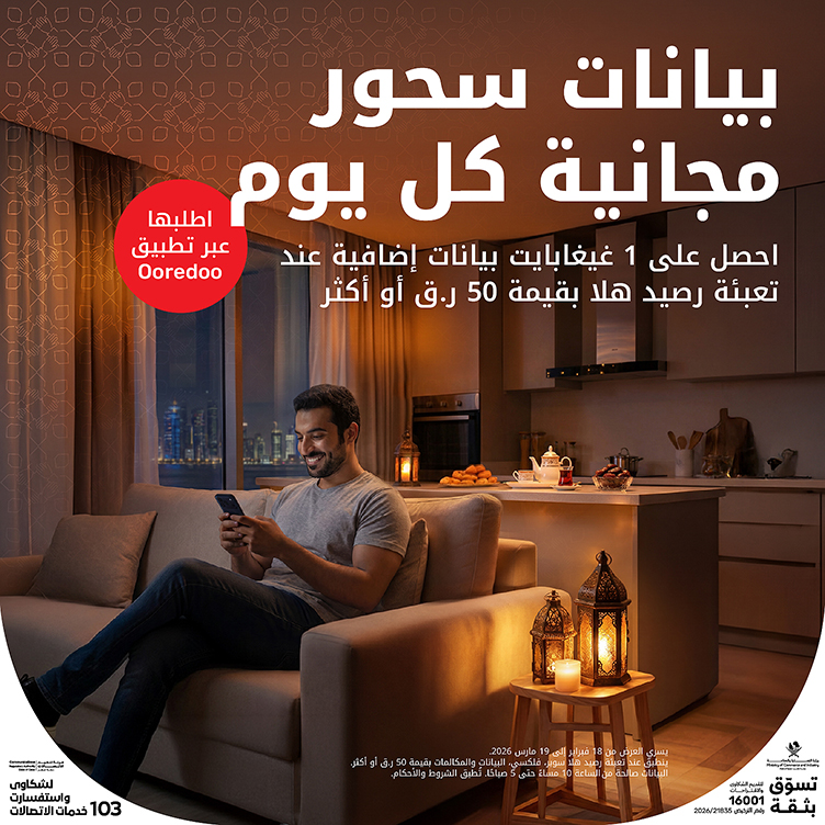 - العرض متاح لعملاء هلا عند إعادة الشحن بقيمة 50 ريالًا قطريًا أو أكثر من باقات سوبر، فليكسي، البيانات، أو الصوت. يشمل العرض بيانات محلية فقط، ولا ينطبق على إعادة شحن رصيد هلا.