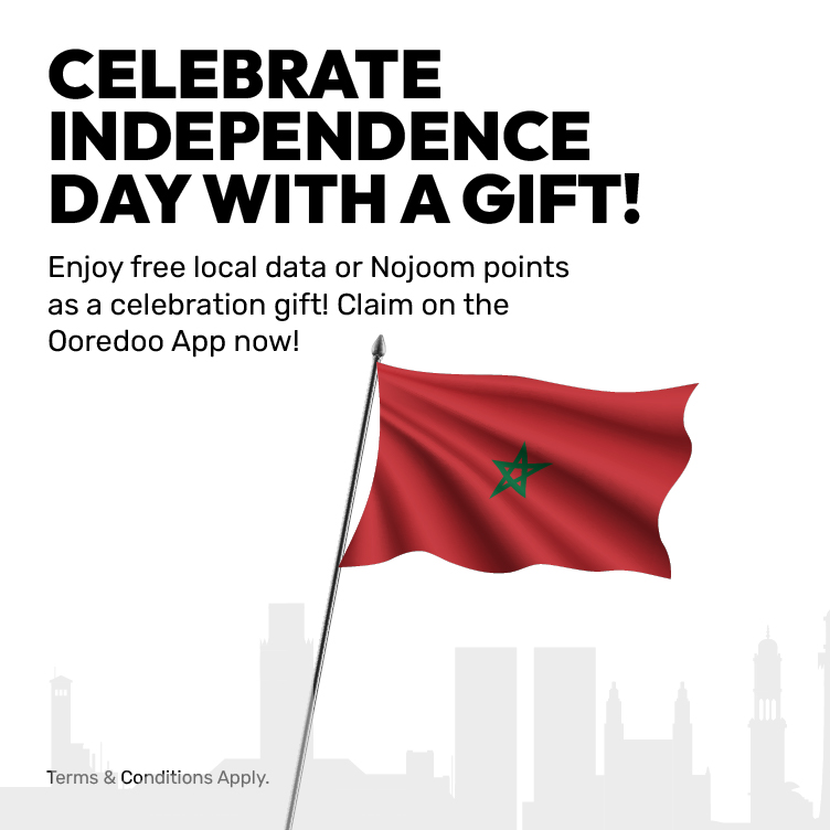 Exciting news on Morocco Independence Day! Postpaid customers with limited packs will enjoy an extra 2GB of free local data valid for 24 hours, while those on unlimited packs will receive a bonus of 500 Nojoom points valid for 3 months! Claim on the Ooredoo App now!