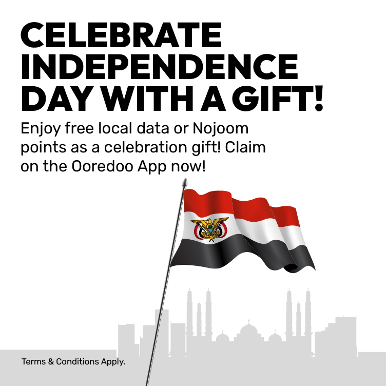 Exciting news on Yemen Independence Day! Postpaid customers with limited packs will enjoy an extra 2GB of free local data valid for 24 hours, while those on unlimited packs will receive a bonus of 500 Nojoom points valid for 3 months! Claim on the Ooredoo App now!